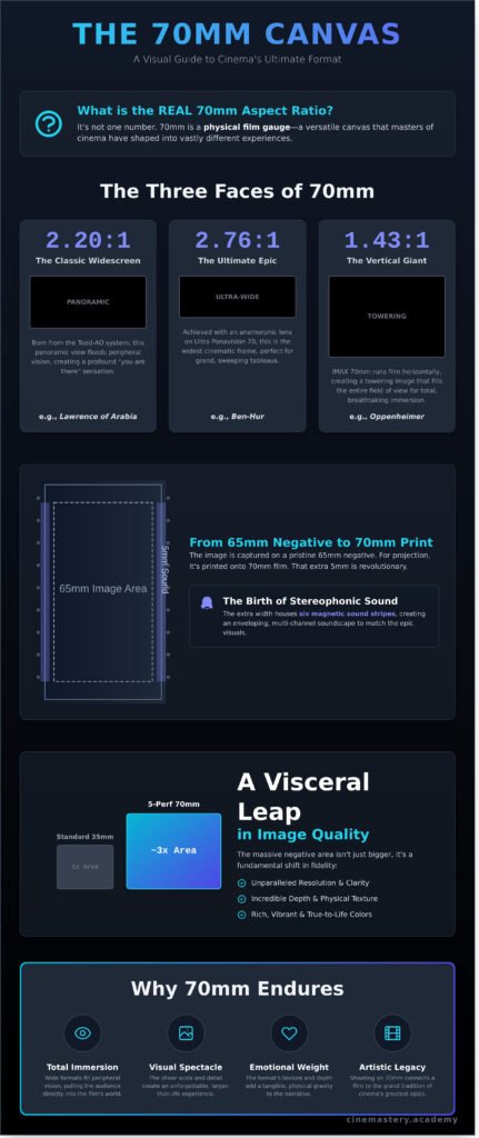 - Standard 70mm (Todd-AO): The classic 2.20:1, offering a vast, panoramic view.