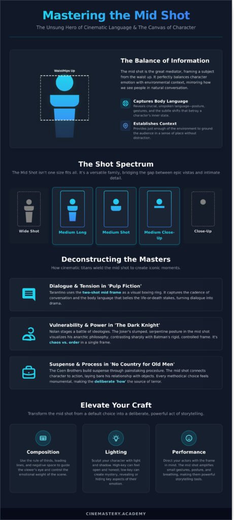 - Transform the mid shot from a default choice into a deliberate, powerful act of storytelling by orchestrating it with lighting, composition, and performance.